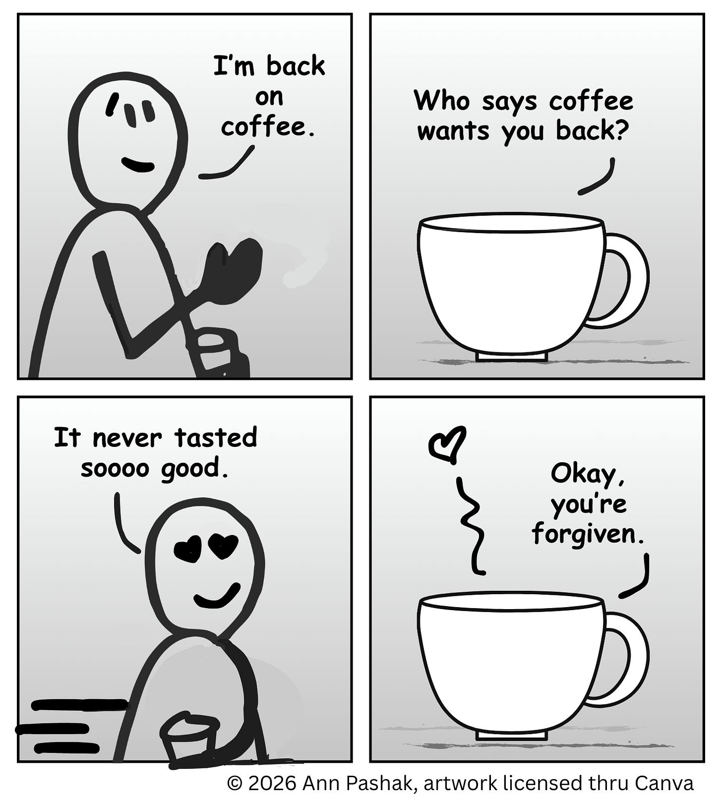 I don’t expect you to give up drinking coffee just to get the thrill of drinking it again, but if you do, bravo/brava! And may your next cup of coffee be a whole pot.