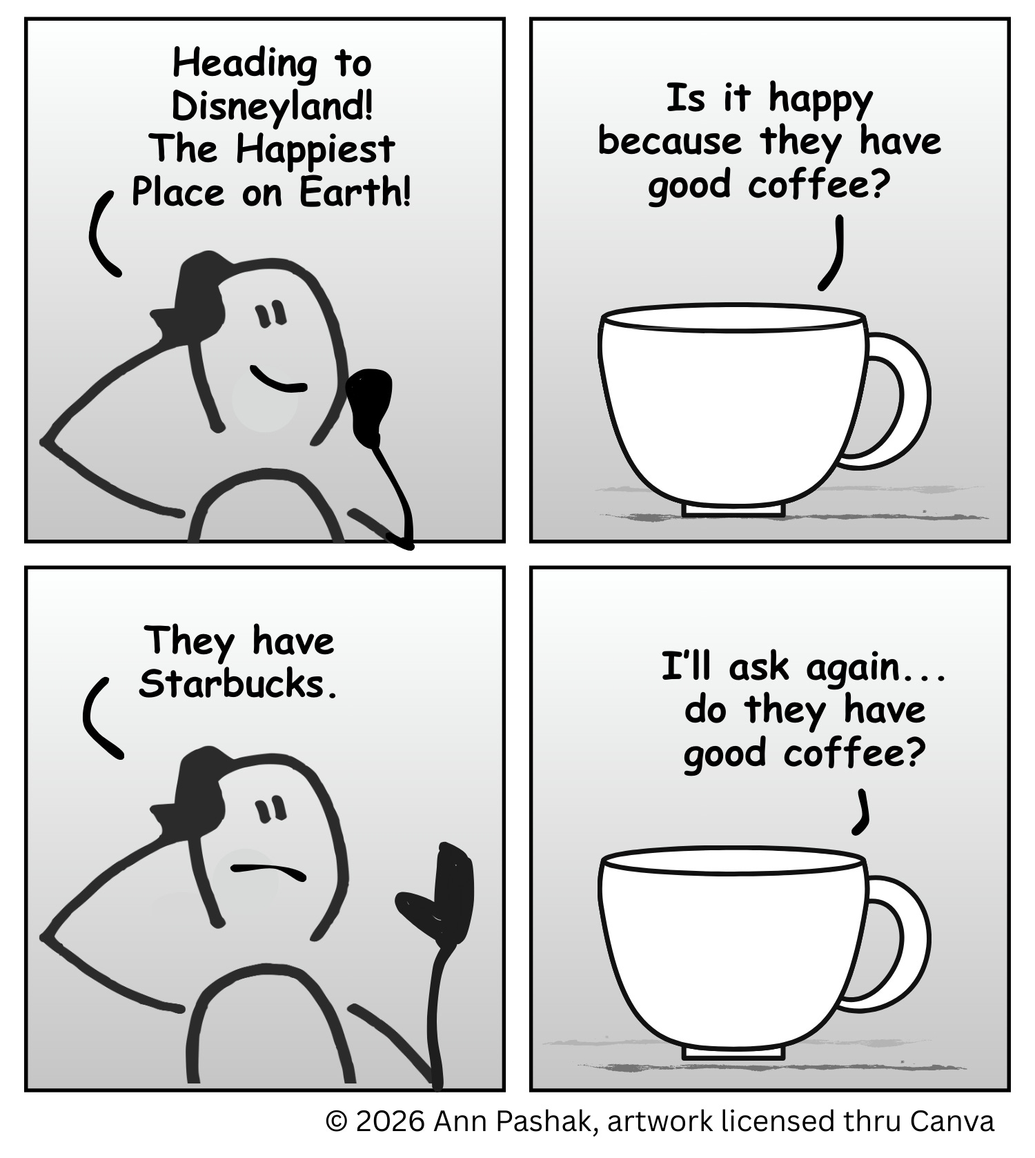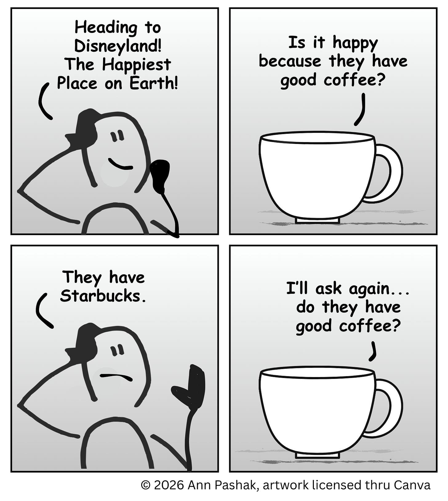 Disney has Starbucks, so I’m okay skipping it. However, I have a passion for indie coffee houses. Love discovering them. Love the atmosphere. Love the unique coffee choices. And now they are off my agenda, at least when I’m traveling. If someone gave me the option between superhuman powers or being able to drink as much coffee as I want and not having to run to a bathroom every ten minutes, I’d choose the coffee one.
